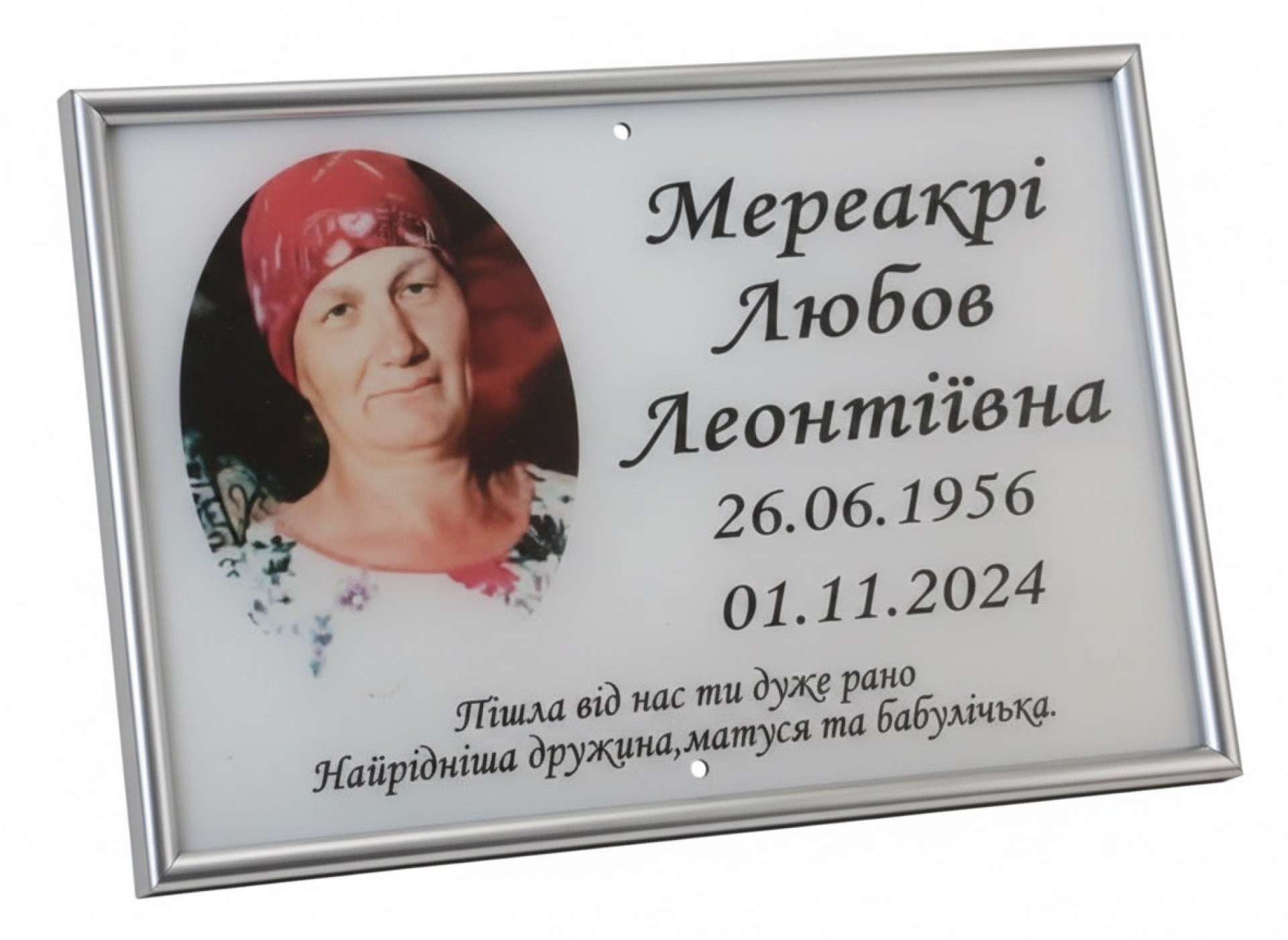 Фотографія на склі ( акрил) з текстом та з захисним матеріалом на задній частині для максимально довгої експлуатації фарб фотографії. Табличка кріпиться на крест або пам'ятник.
