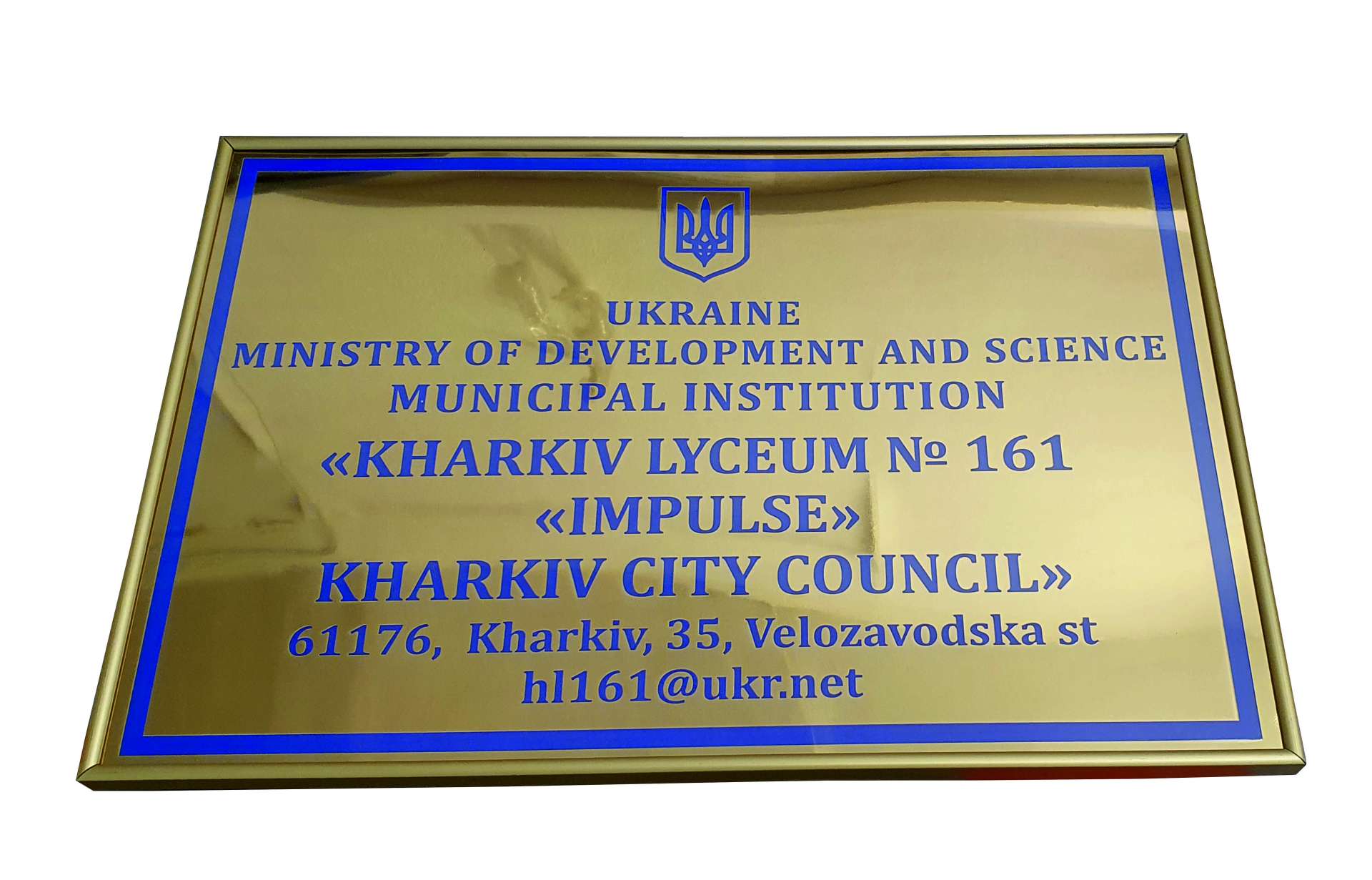 Вивіска із золотого пластику із захисним прозорим склом у захисній золотистій алюмінієвій рамці у Львові. Виготовляємо будь-який розмір вивіски з індивідуальним прорахунком.
