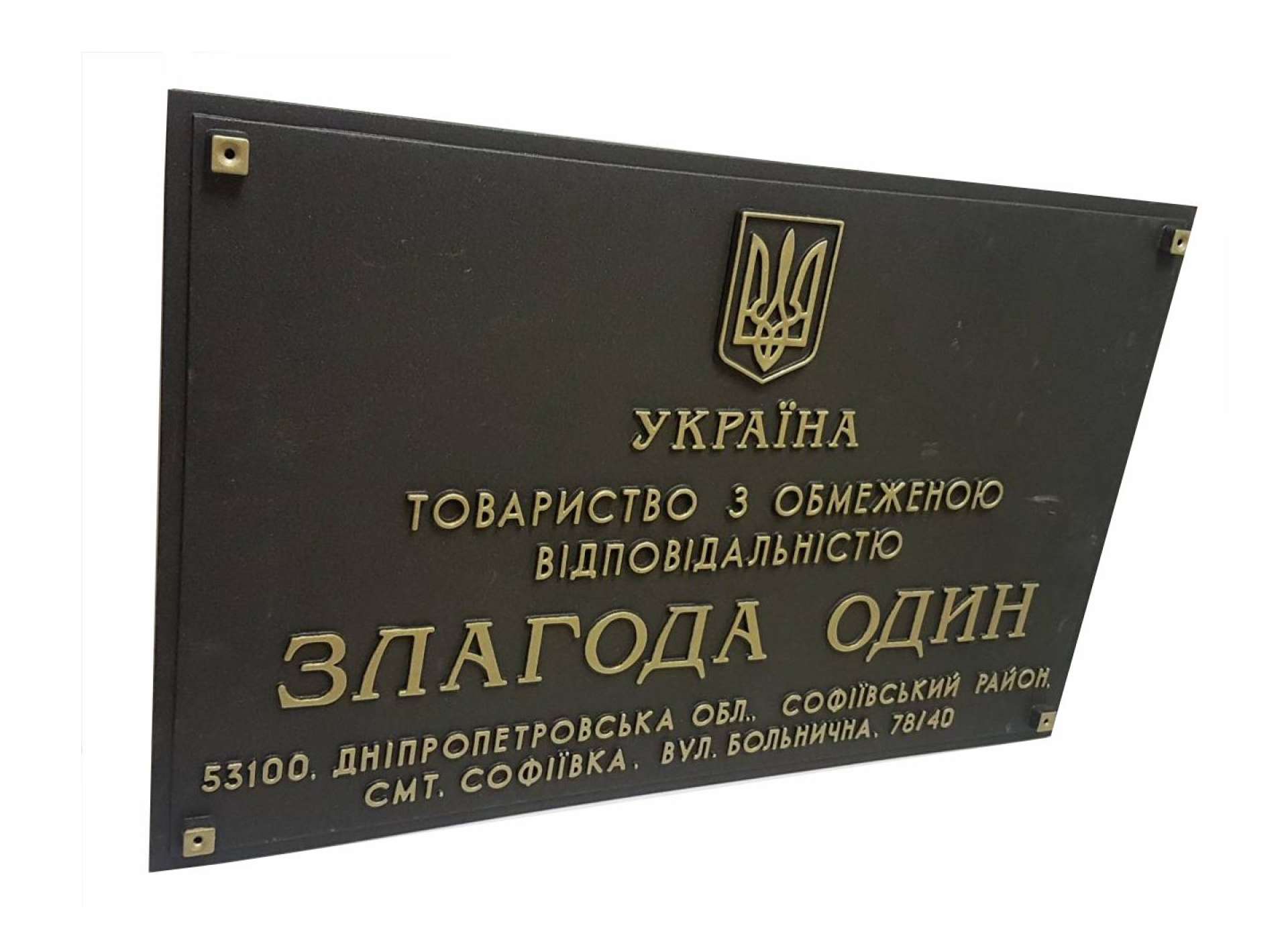 Вивіска робиться із пластику з покриттям фарб та лаків. Літери попередньо запресовуються під тиском. Час виготовлення 2,5 тижні. Виготовляємо будь-які розміри з індивідуальним прорахунком цін та дизайну.